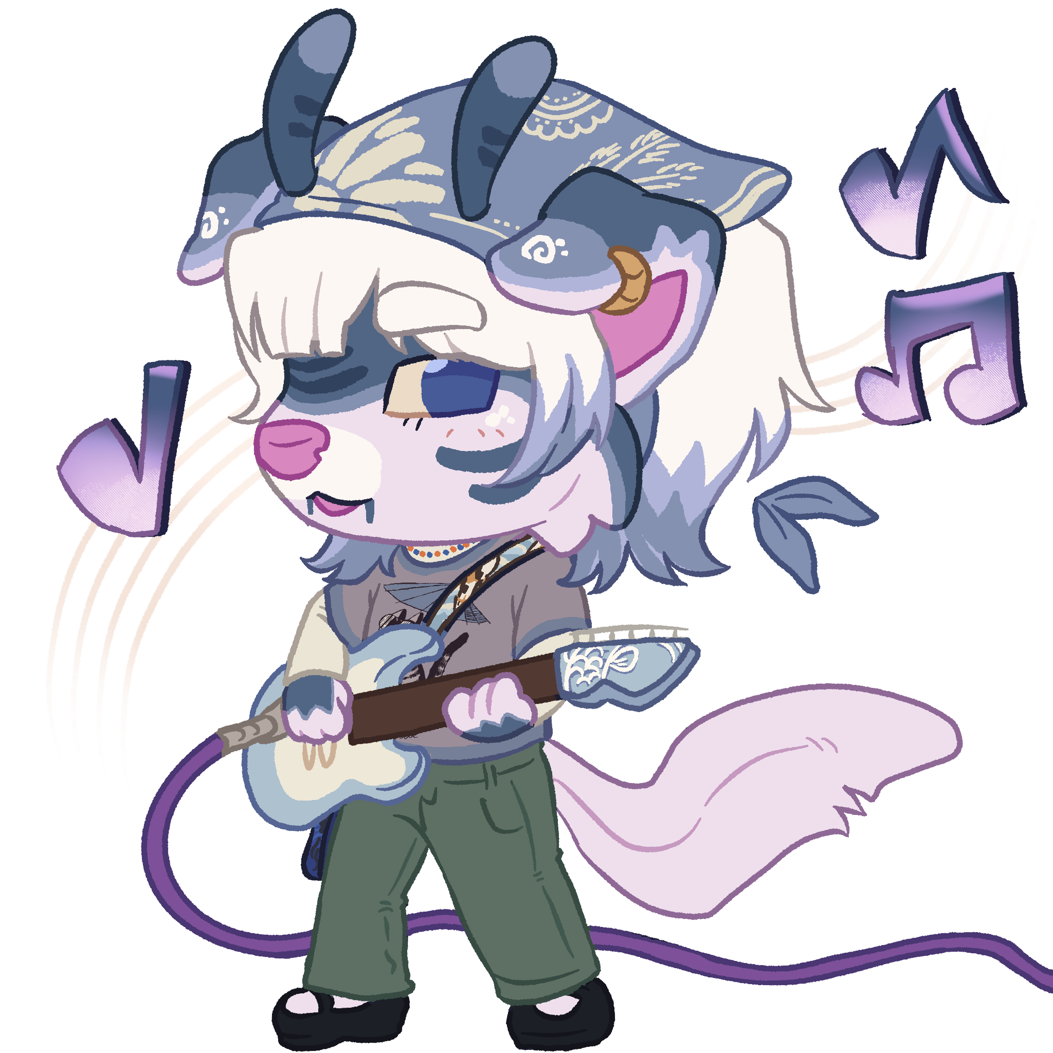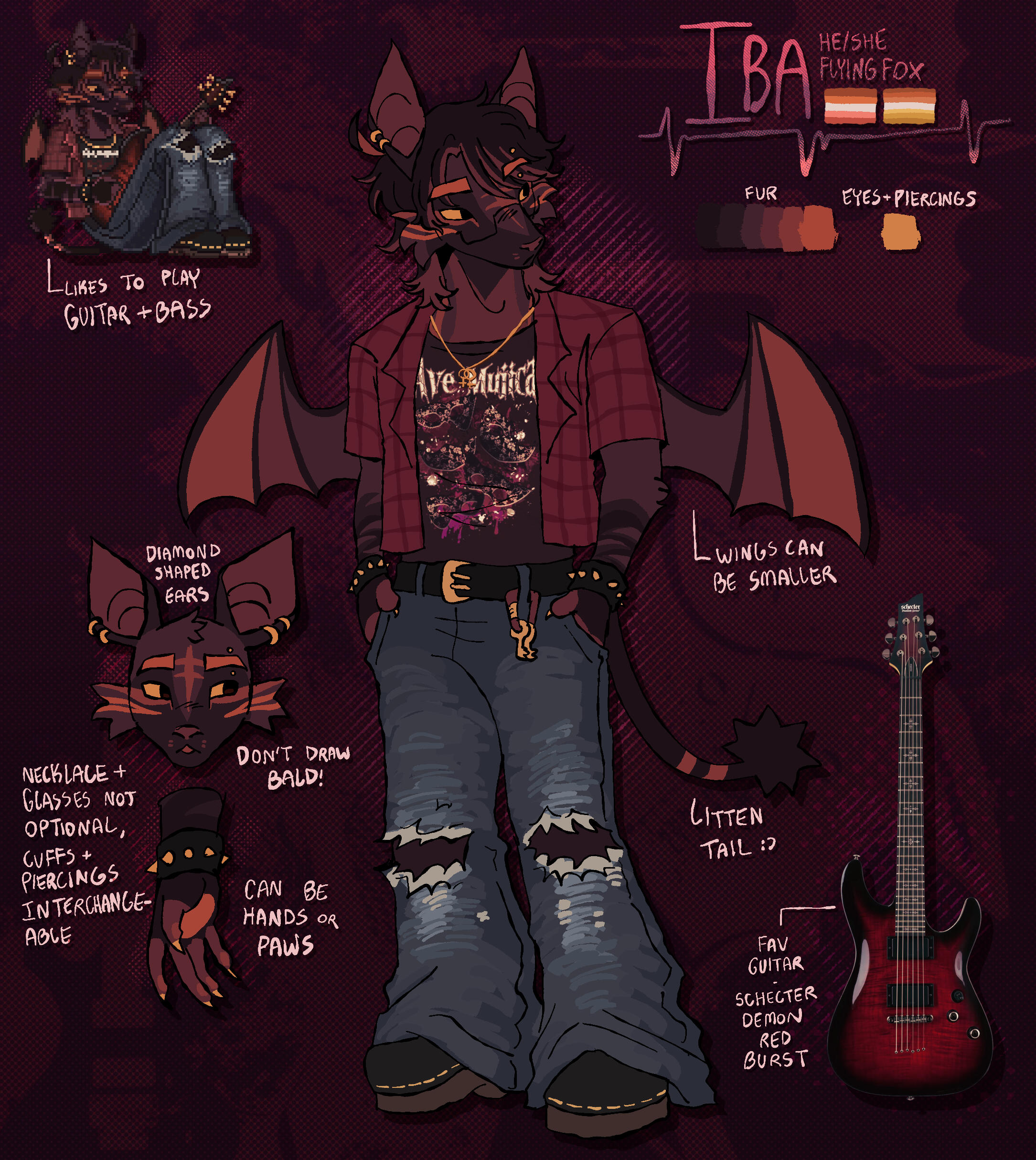like stated above, you may request for a higher complexity ref sheet which can include things such as extra props, outfits, turnarounds, pelt references (that do not include the facial markings) and etc. feel free to ask and we can work smth out!