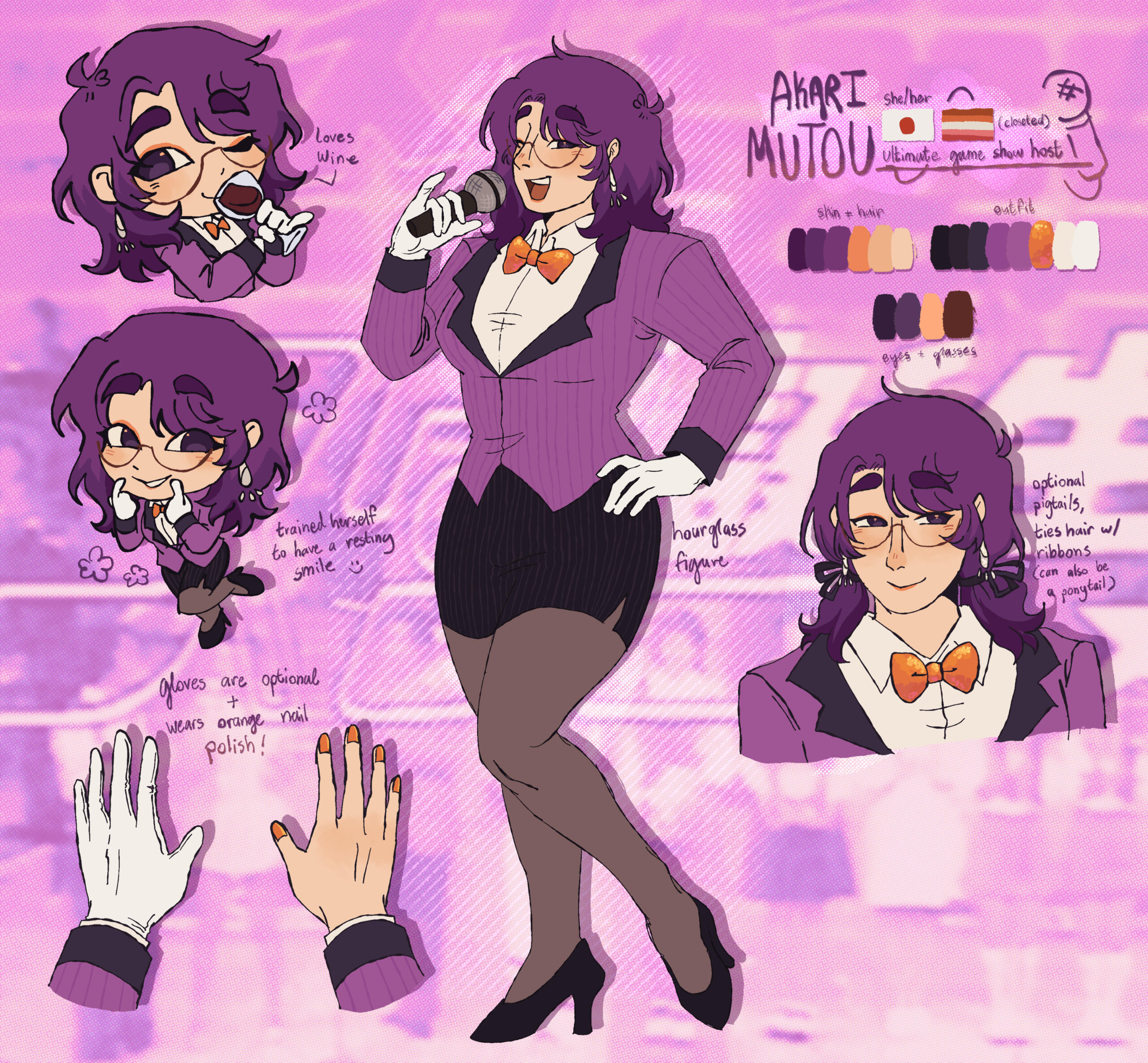 i will usually ask for info such as species, hairstyles(if needed), color palettes, and any other physical notes and personality traits that should be noted in the design. pinterest boards and the like are welcome!
